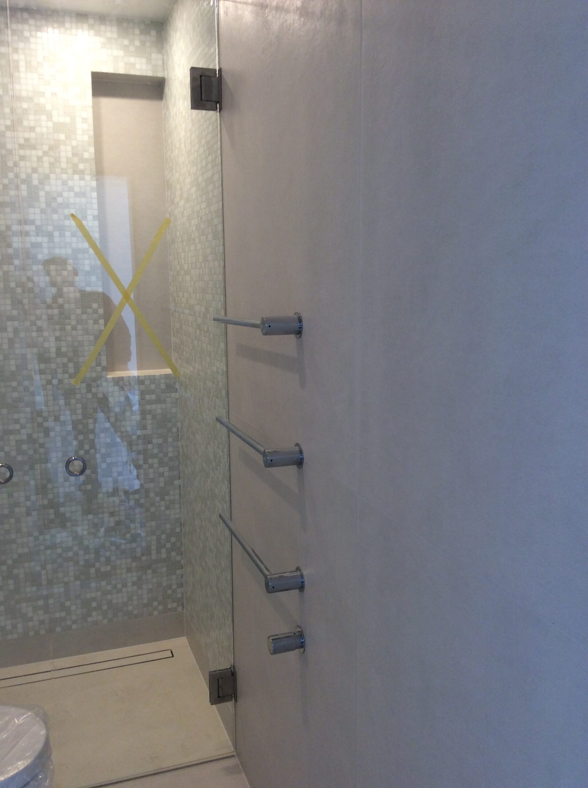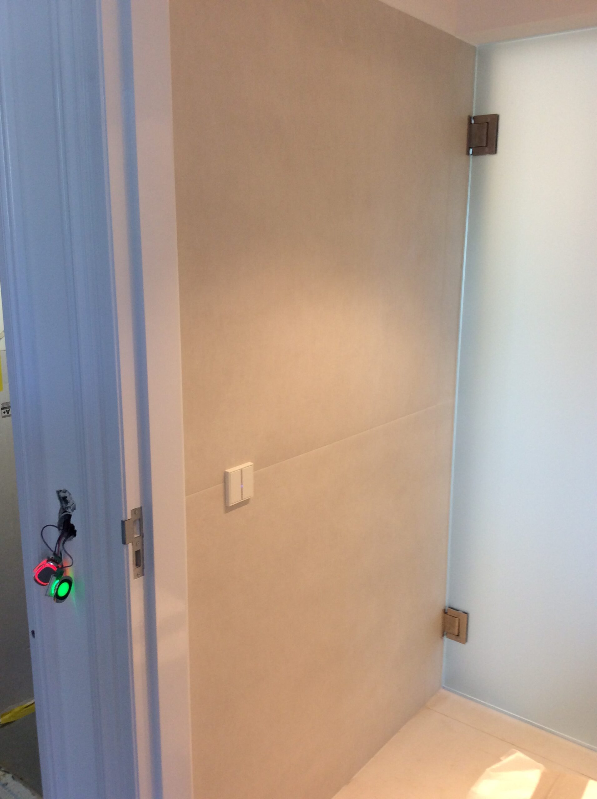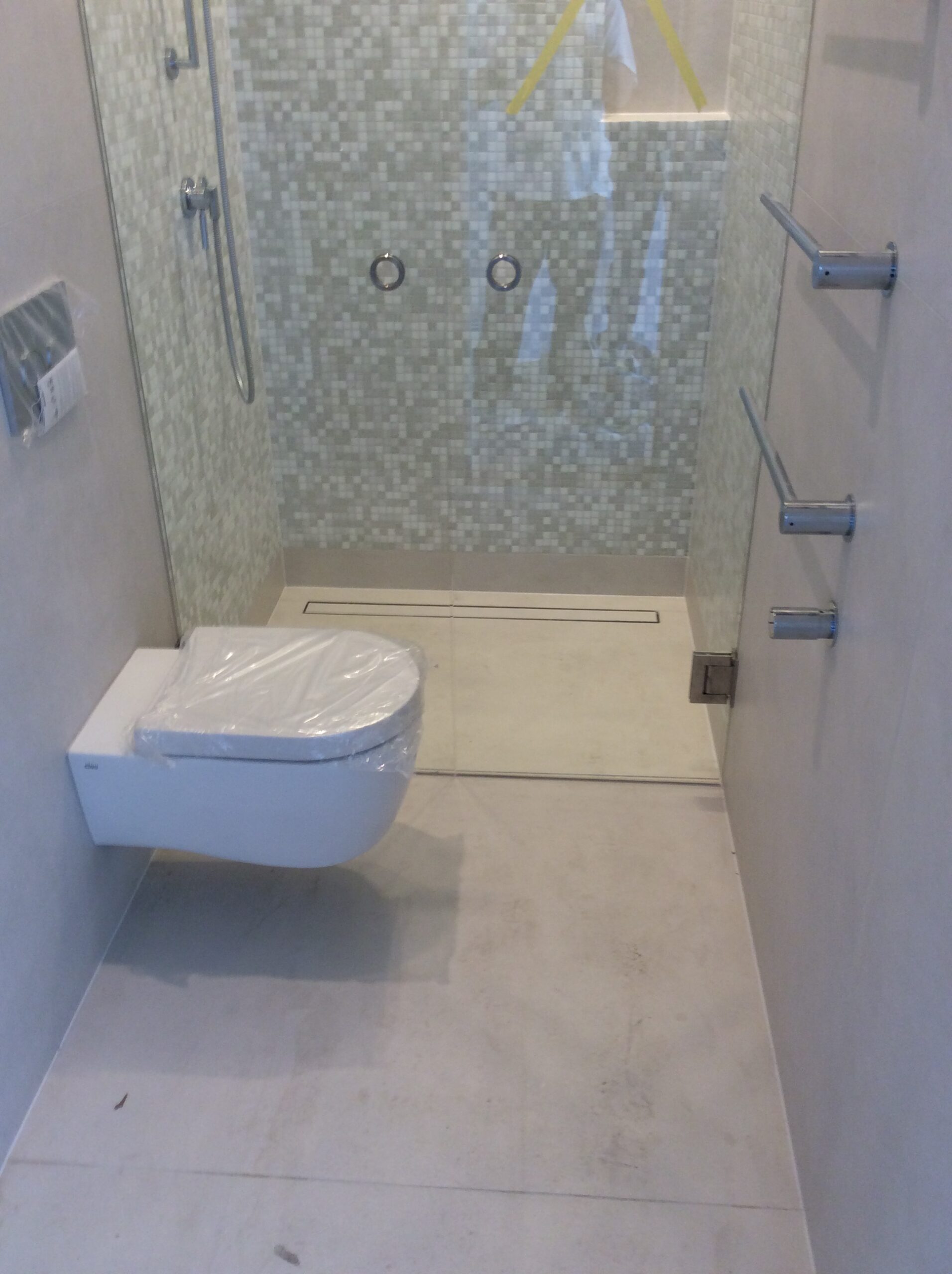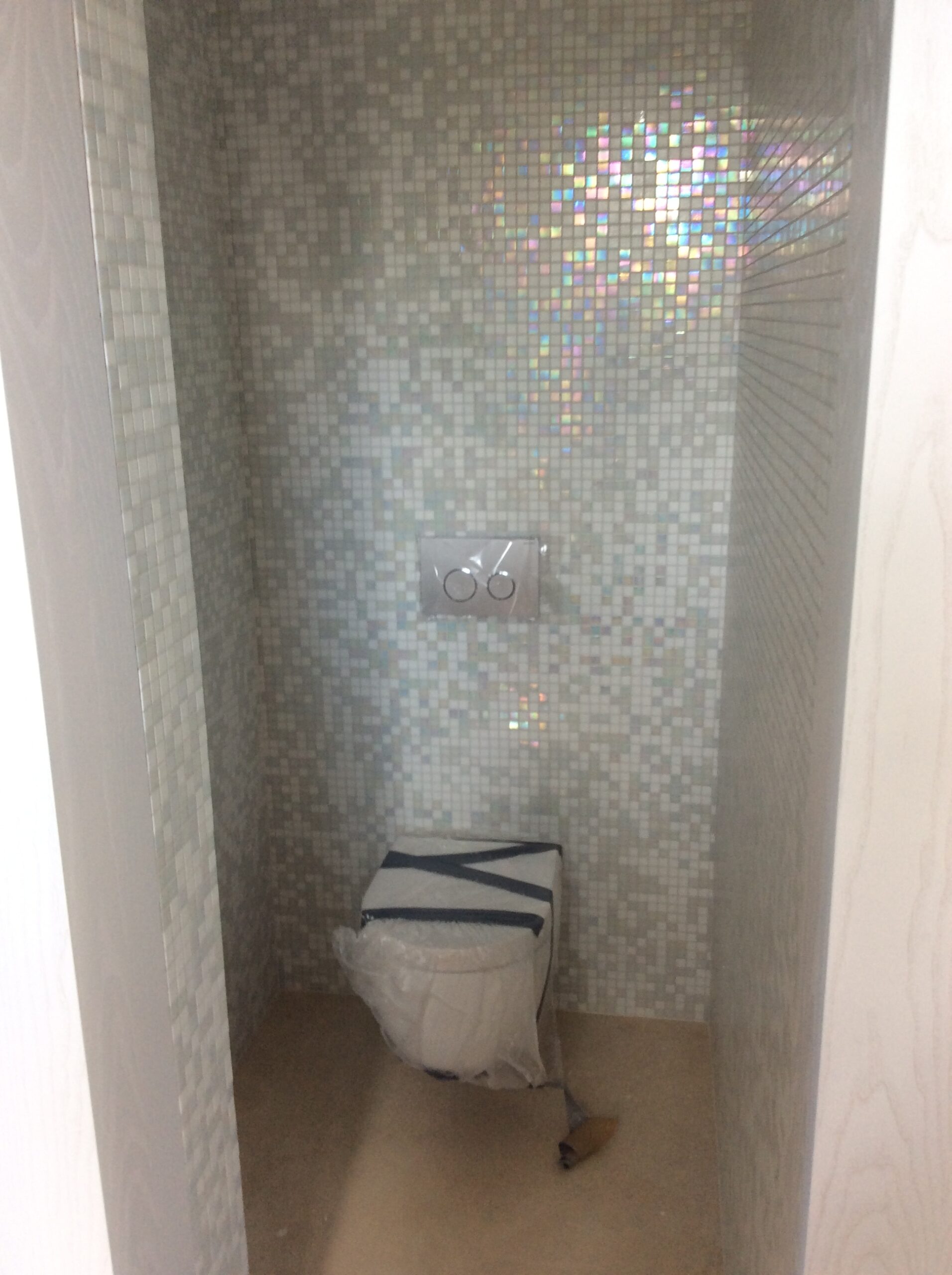 Voor 2 badkamers en een toilet hebben de bewoners van dit nieuwbouwpand gekozen voor mozaïek van het merk Bisazza. Dit in combinatie met een tegel in groot formaat.