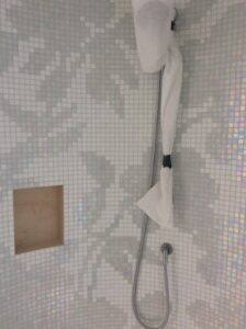 Voor 2 badkamers en een toilet hebben de bewoners van dit nieuwbouwpand gekozen voor mozaïek van het merk Bisazza. Dit in combinatie met een tegel
