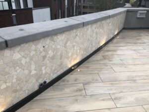 Houtlook vloertegels, wandtegels en een groot formaat tegel op de buitengevel met een uitstraling van marmer; marmerlook. De marmerlook tegel is op dit moment erg