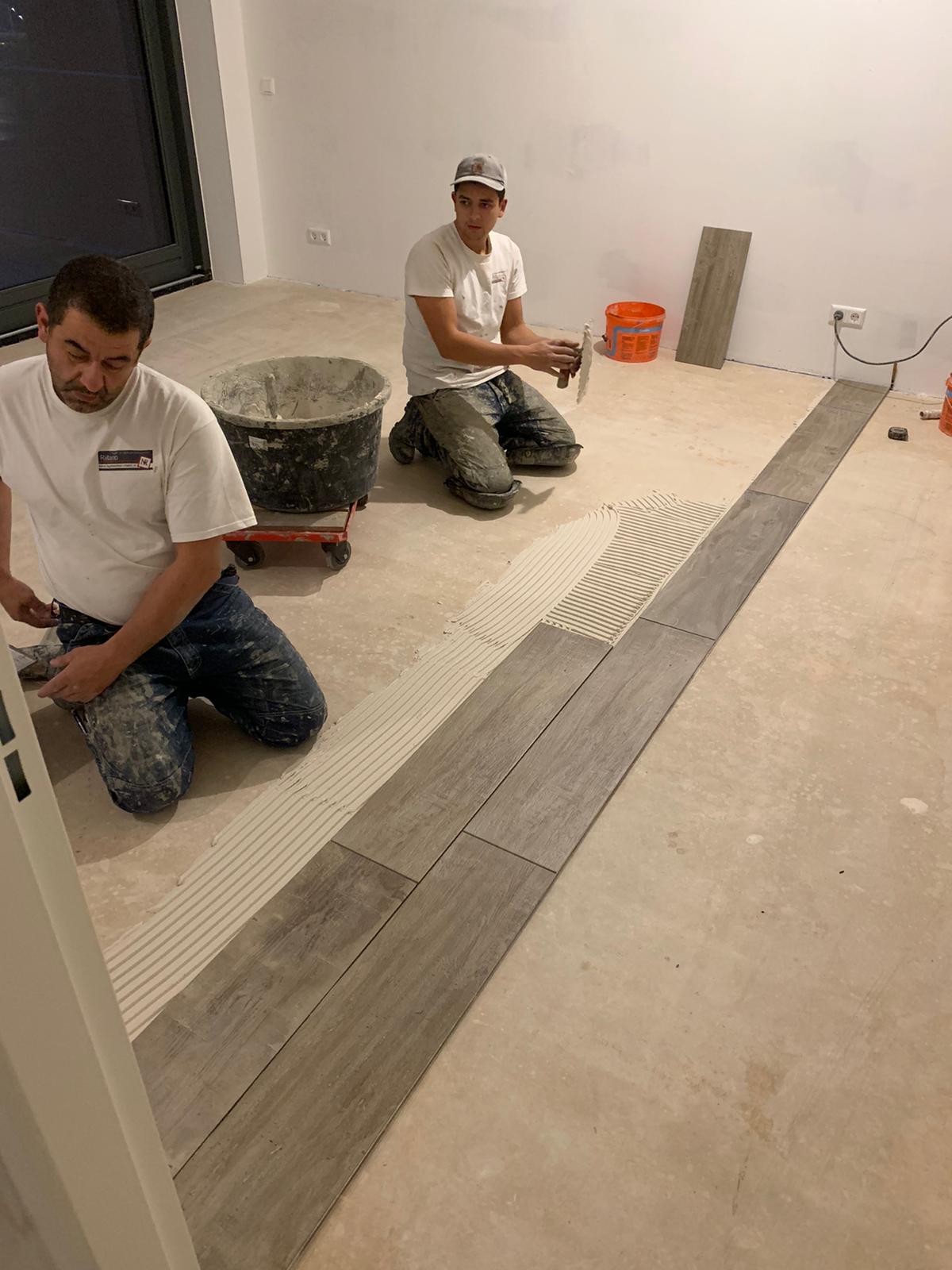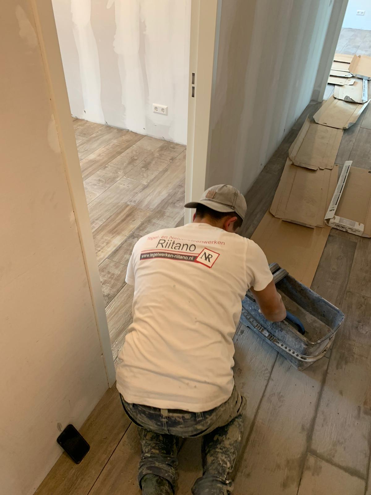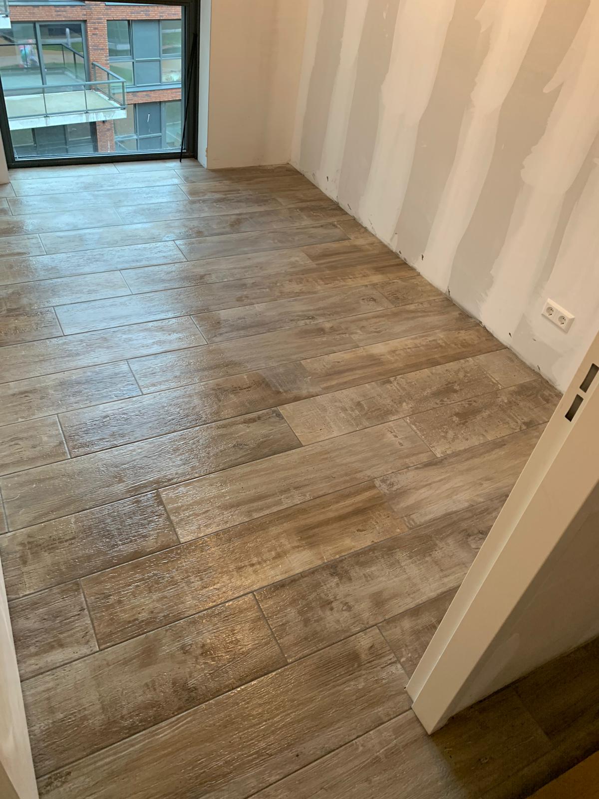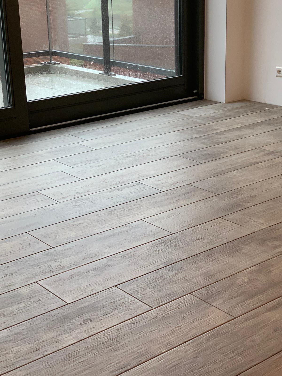 Bij dit project hebben we de keramische vloertegels, in het formaat 23×100, door het hele appartement verwerkt. Als legpatroon is er gekozen voor wildverband. Het afval is door ons meegenomen en afgevoerd.