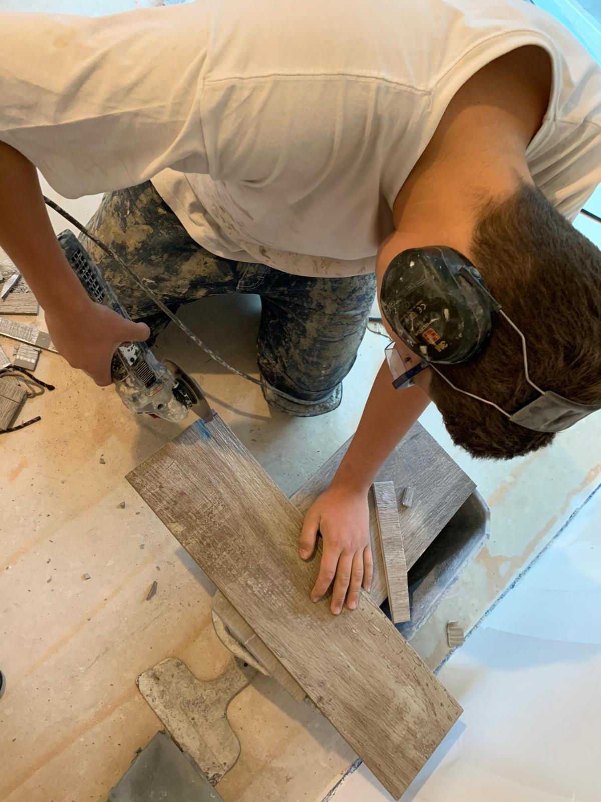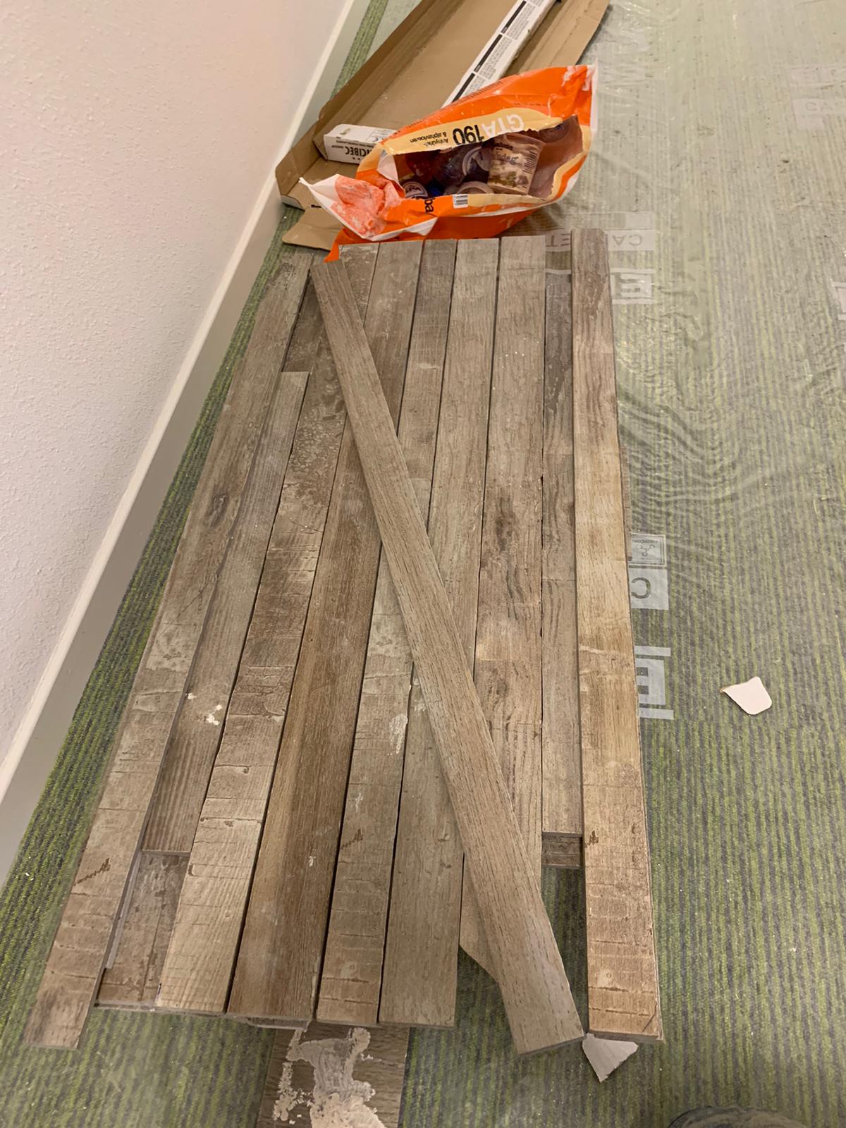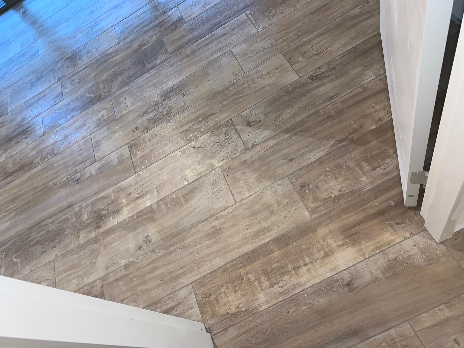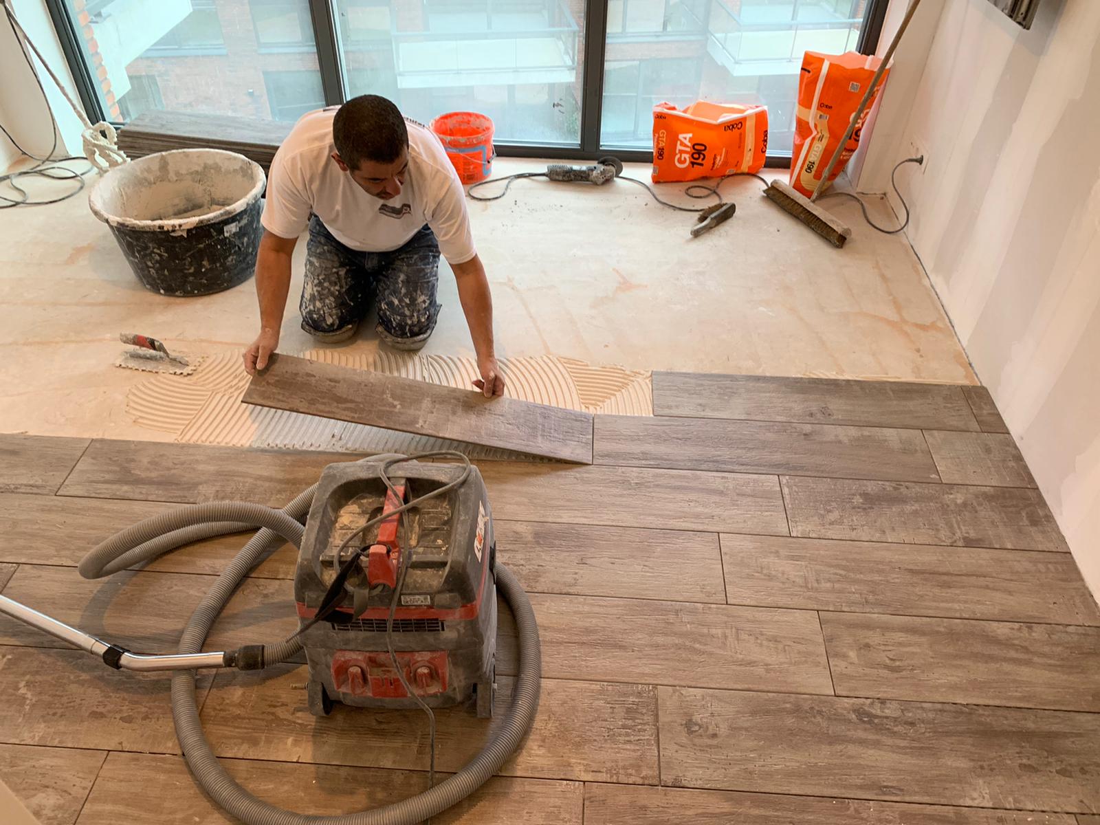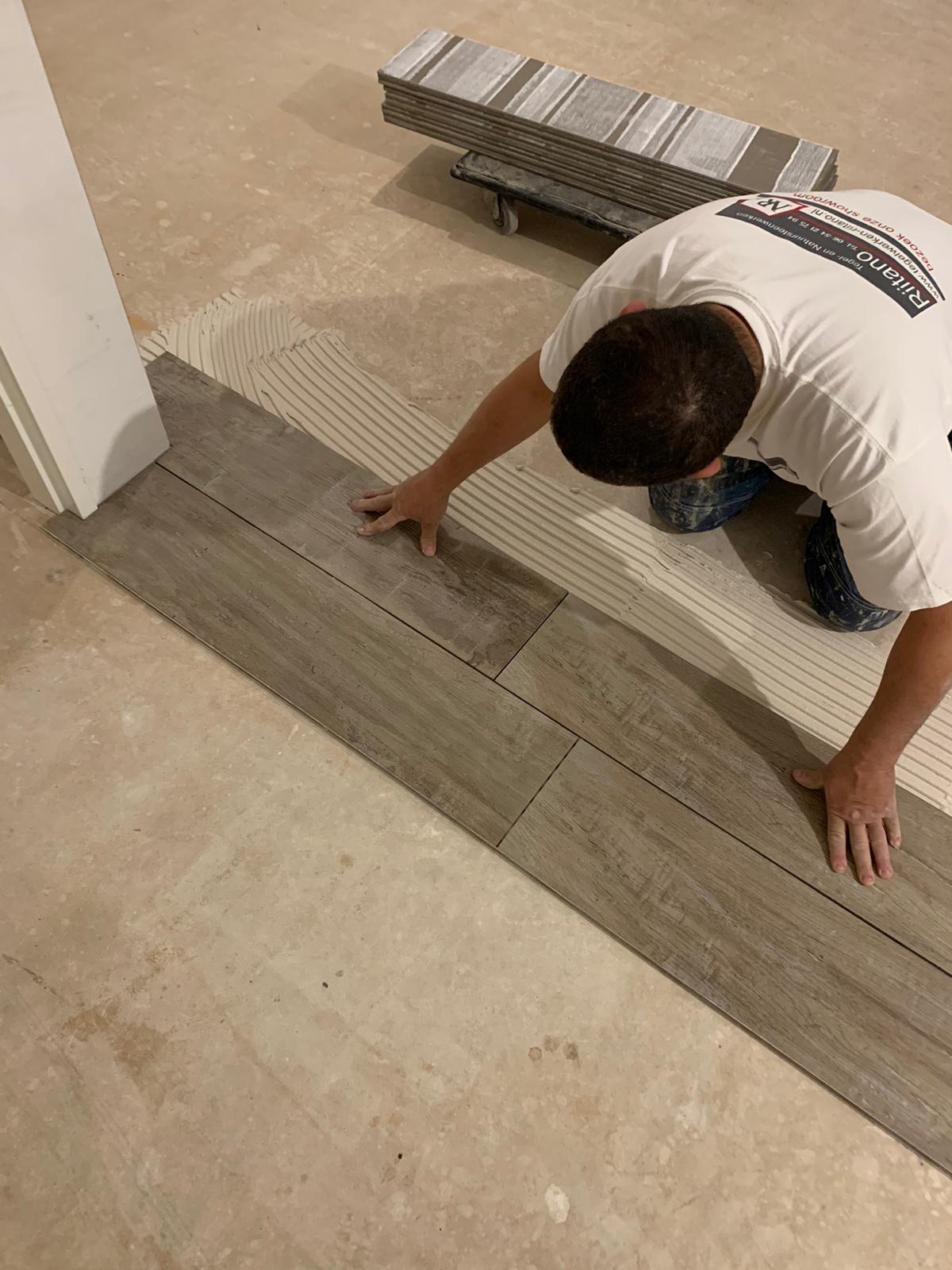Bij dit project hebben we de keramische vloertegels, in het formaat 23×100, door het hele appartement verwerkt. Als legpatroon is er gekozen voor wildverband. Het afval is door ons meegenomen en afgevoerd.