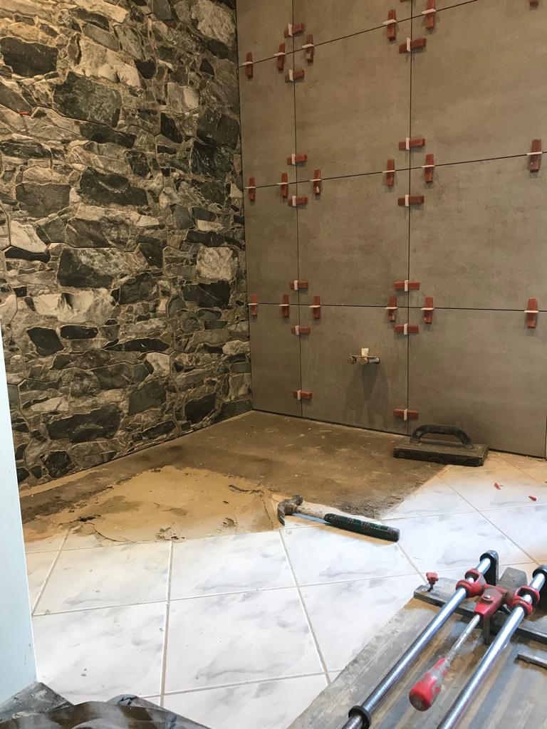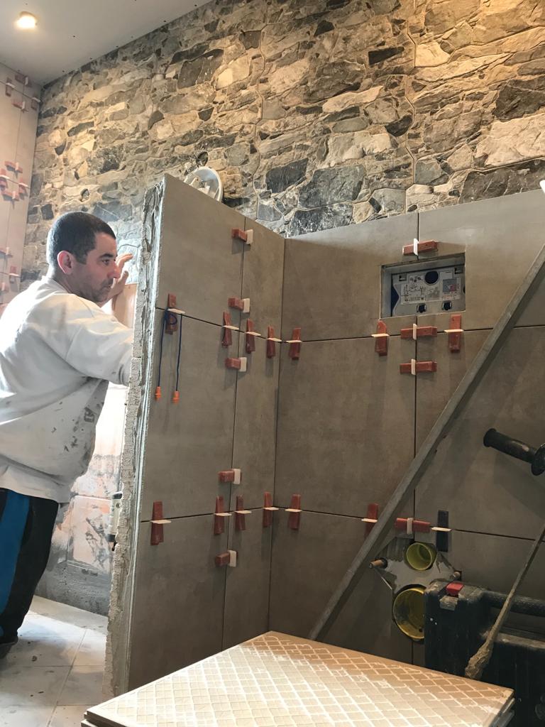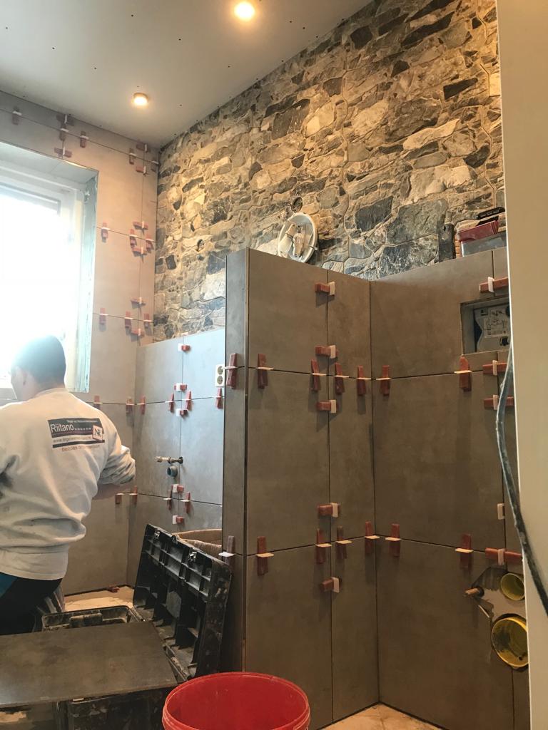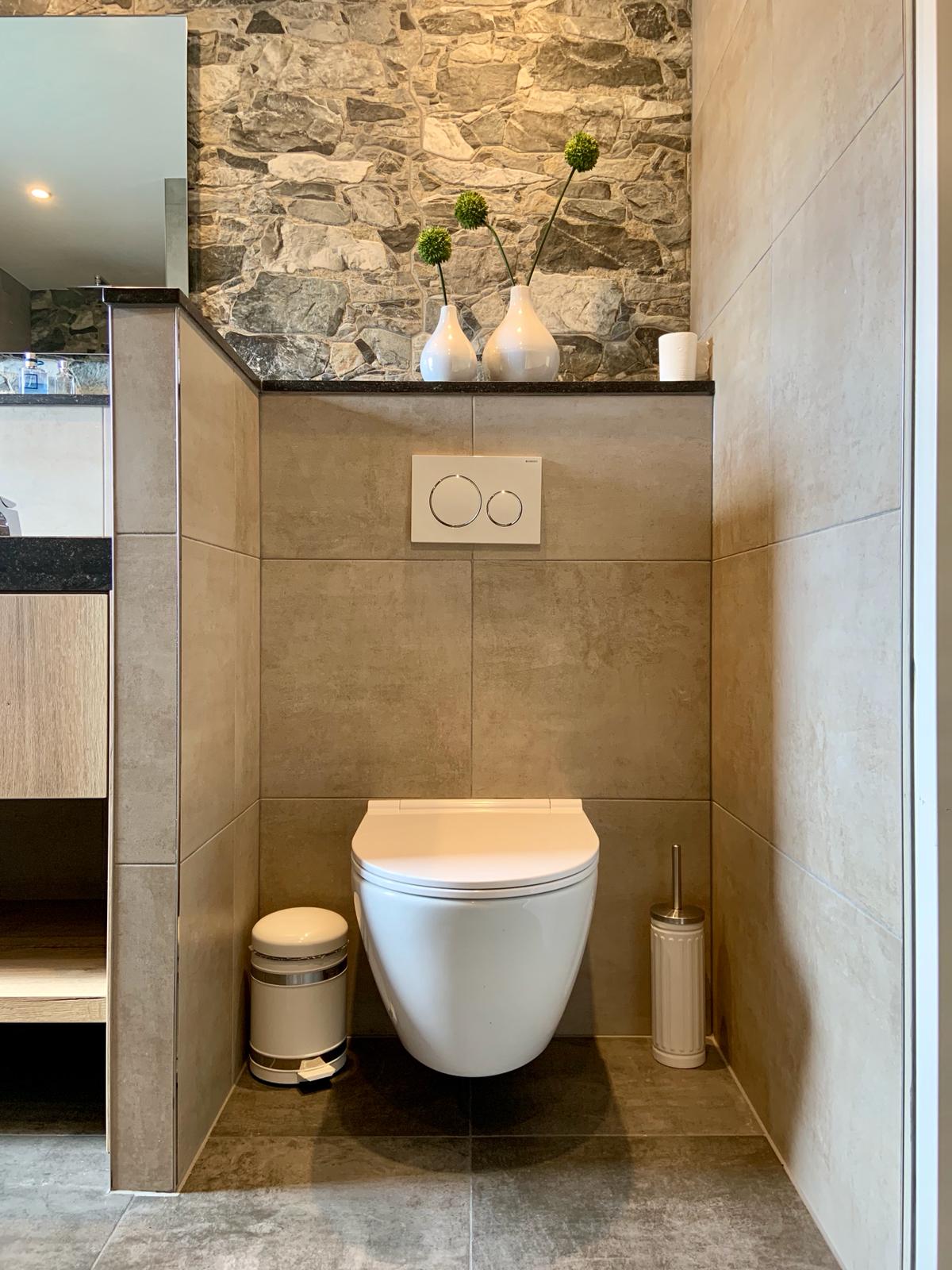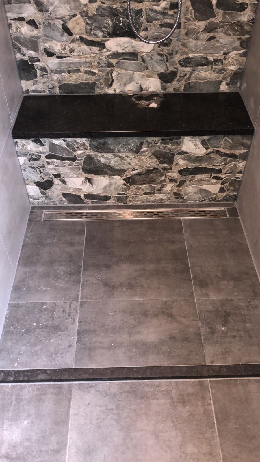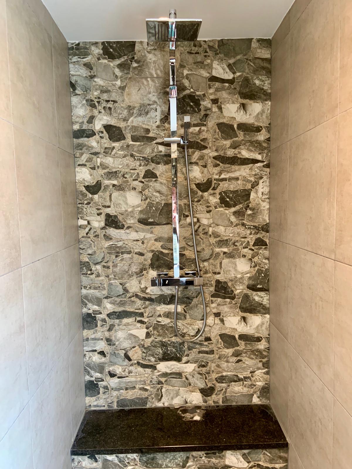 We starten met het uitzoeken van de tegels en natuursteen. De keuze valt op wandtegels en vloertegels van Steenbok Porto in het formaat 45×45. De kleur Taupe op de wanden en op de vloer de Antracite variant. Voor één wand is er iets speciaals in gedachten, La Fenice Wallrock, een nieuwkomer in ons assortiment tegels.