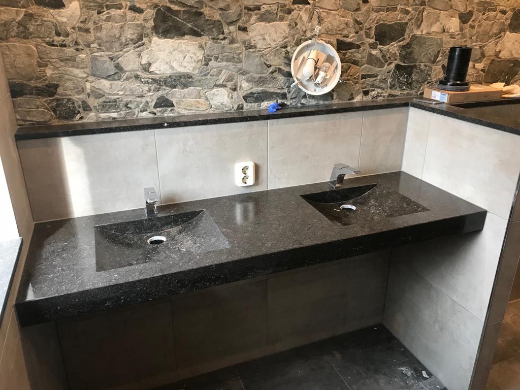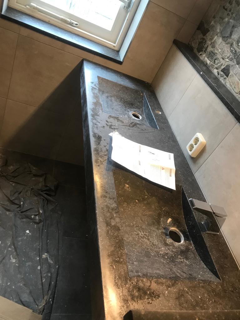 Het natuursteen voor deze badkamer, Belgisch hardsteen donker gezoet, komt uit eigen zagerij; wastafel met 2 wasbakken, plateau in de douchehoek en diverse afwerkplaatjes.