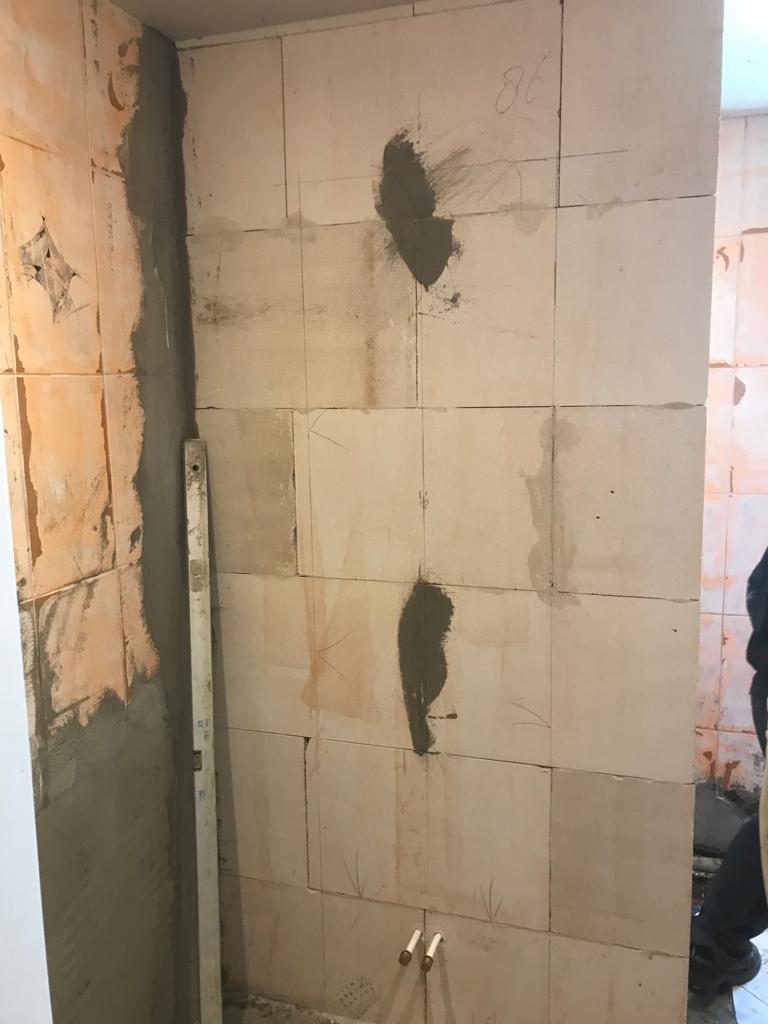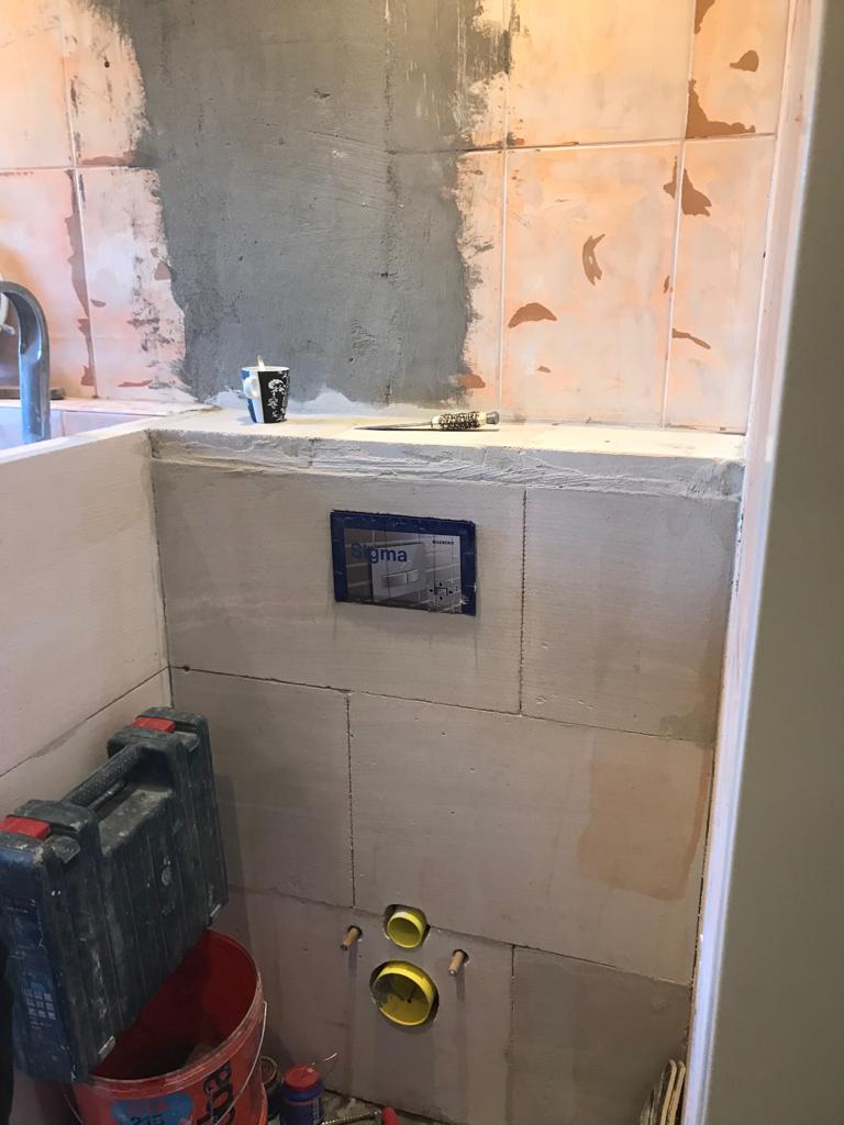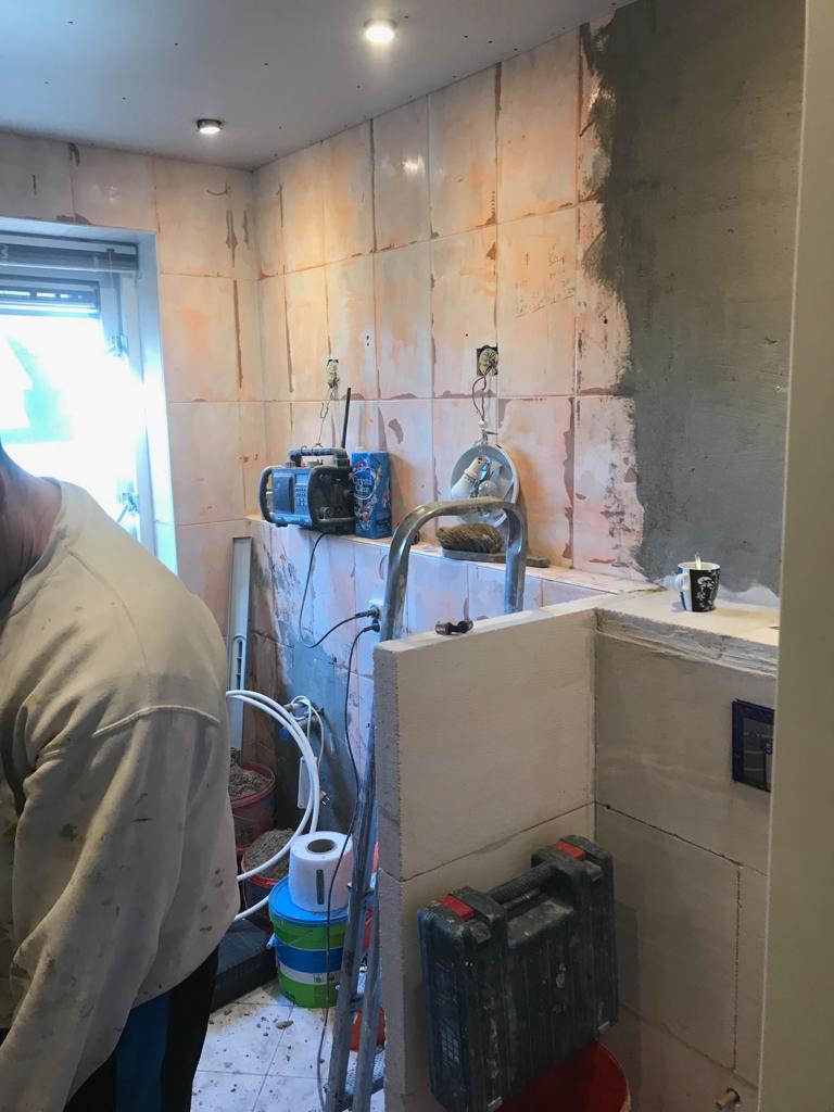 Werkzaamheden verbouwing badkamer worden gestart. Slopen oude badkamer, puin afvoeren, loodgieterswerkzaamheden en tegelzetten.