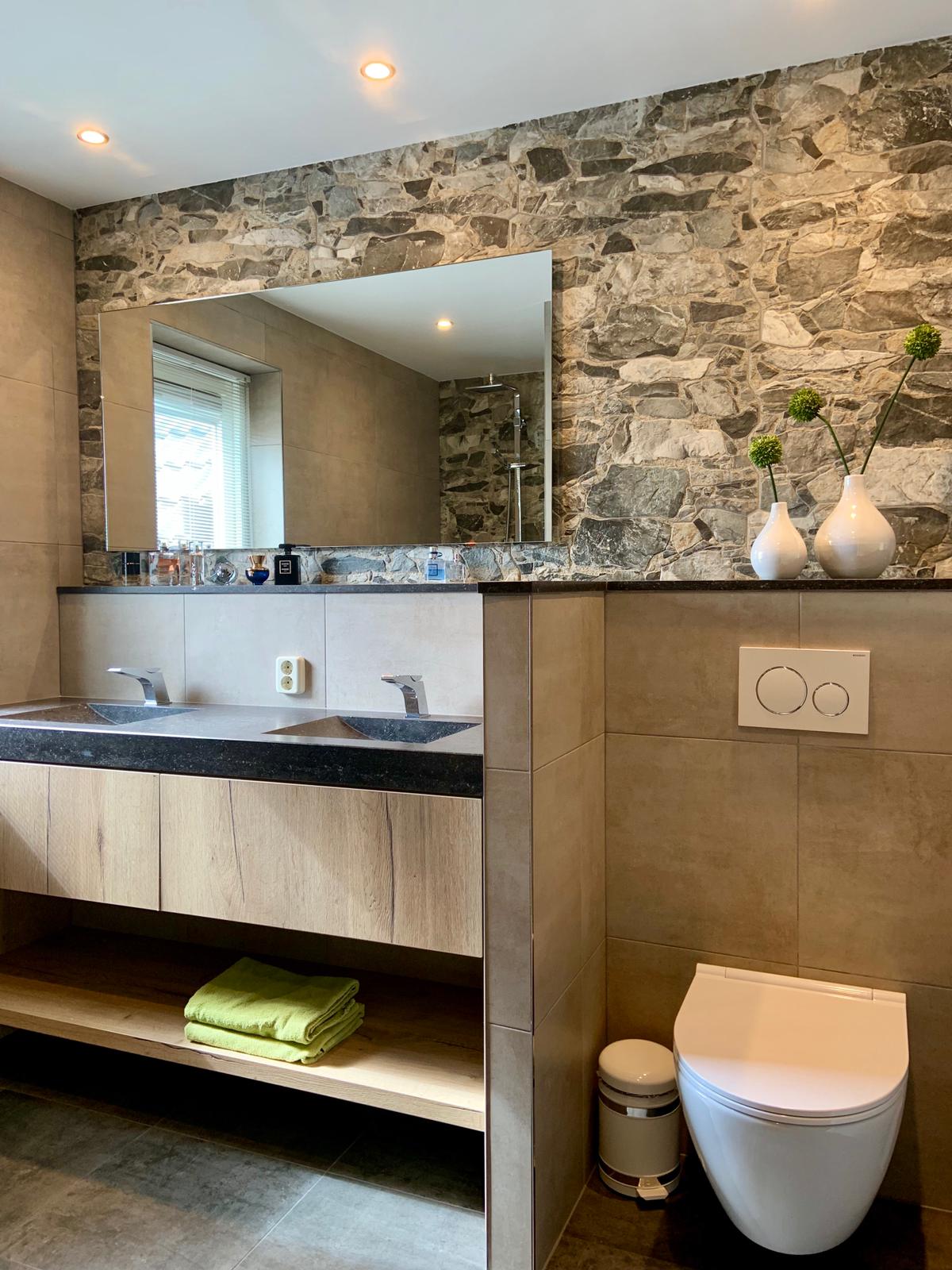 Om een badkamer van begin tot eind te realiseren, schakelen wij eventueel vakmensen in zoals bv een loodgieter of stukadoor. Bij deze badkamer is de op maat gemaakte spiegel evenals het sanitair via ons geleverd. Ondanks het samenwerken met collega’s blijven wij aanspreekpunt voor het hele project.