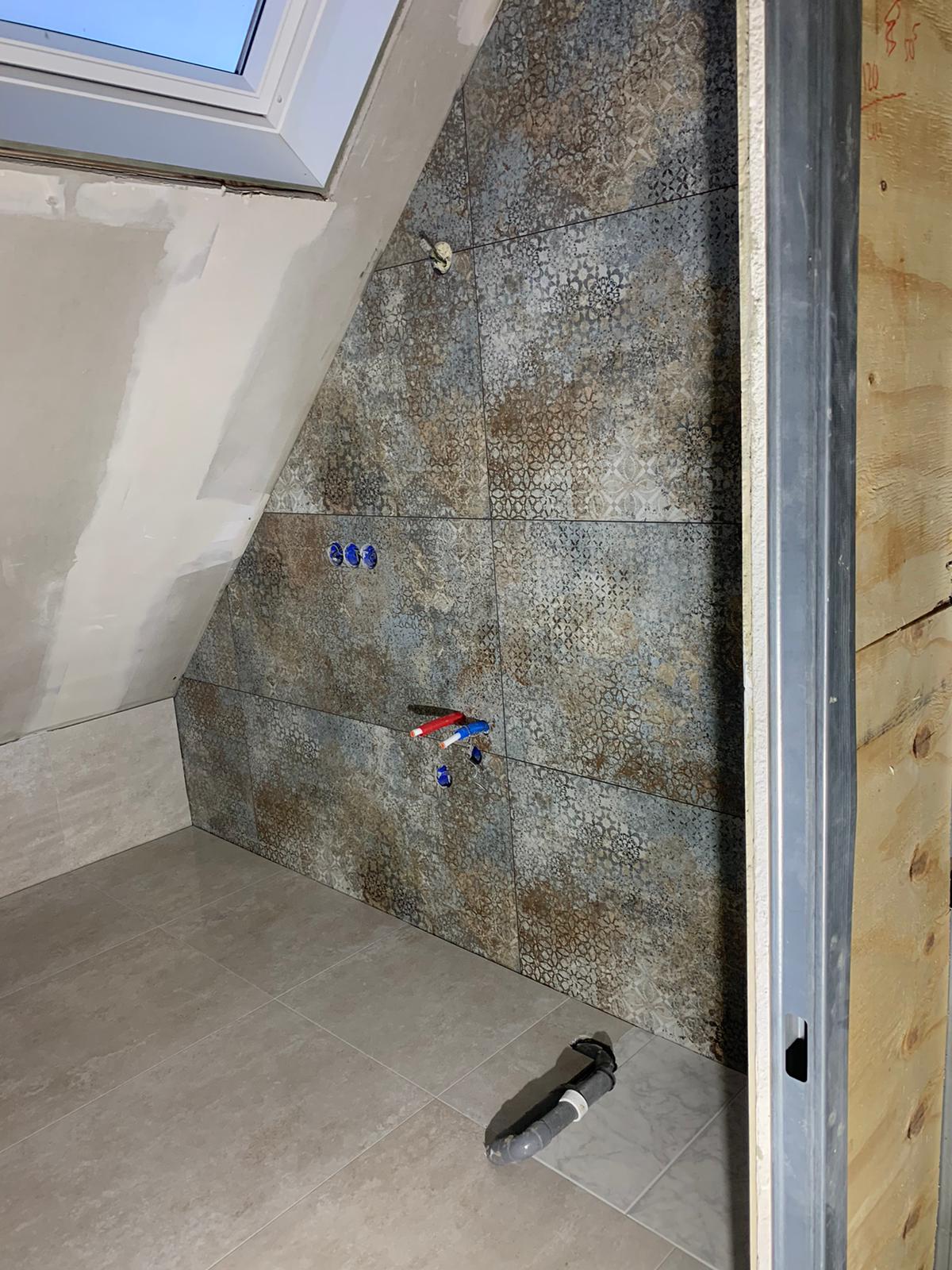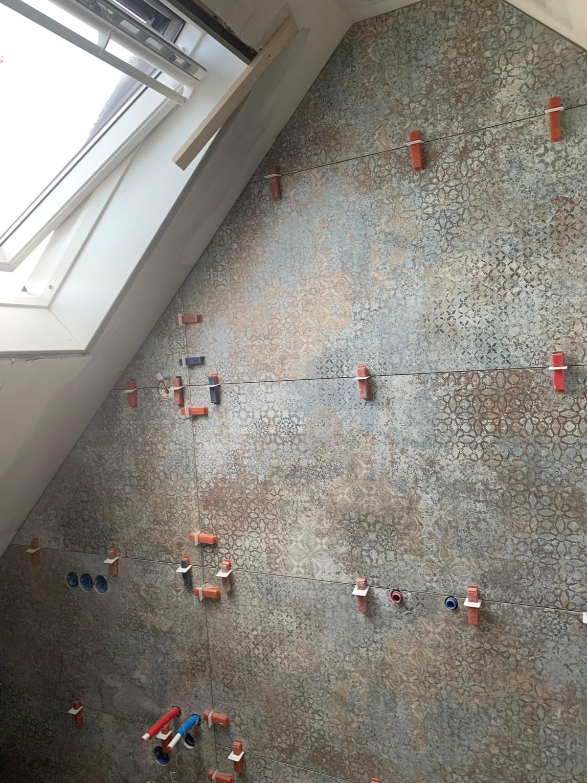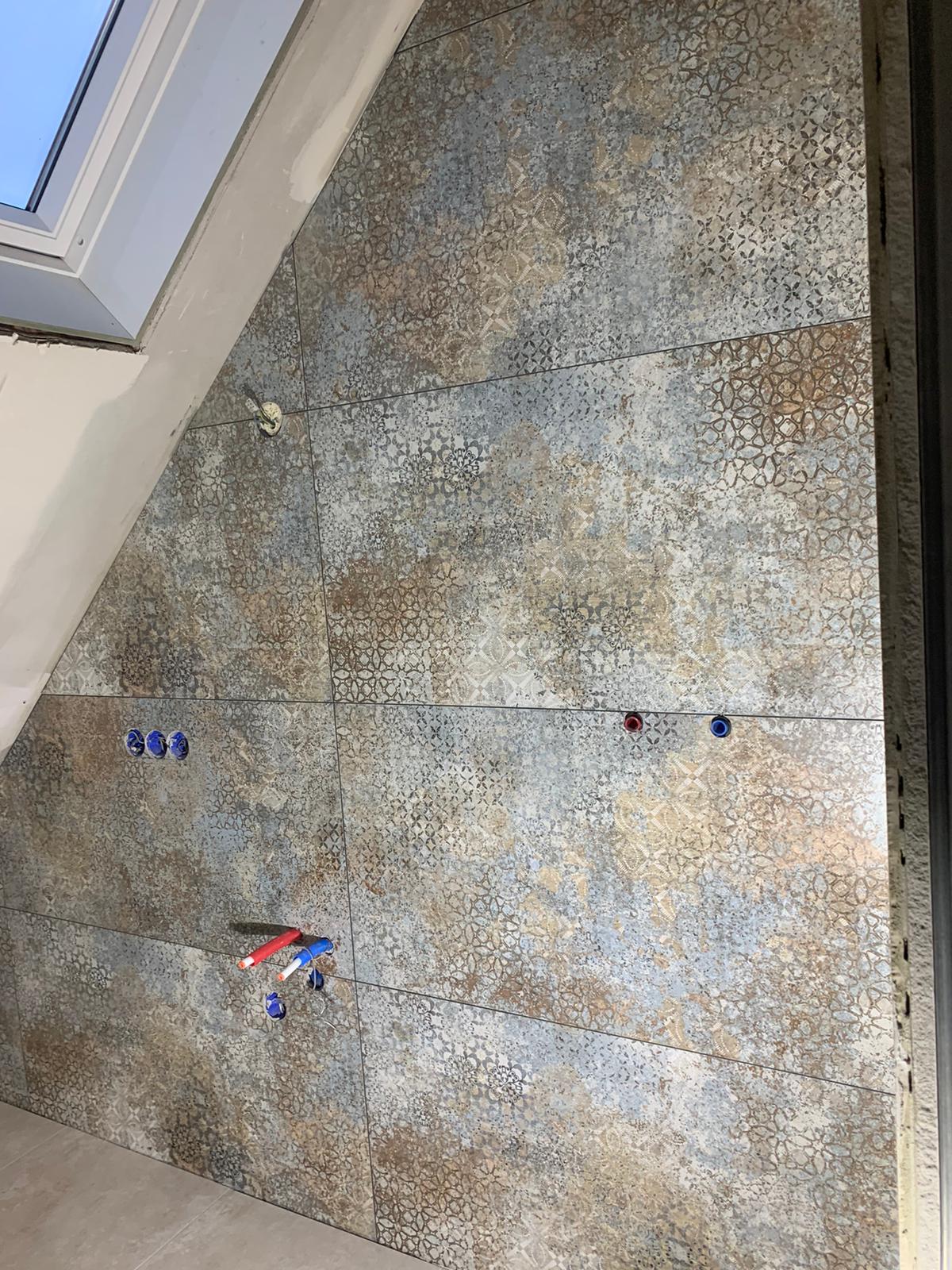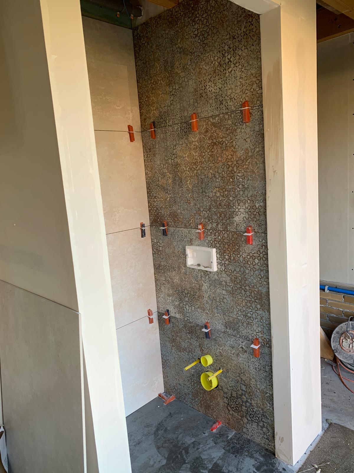 Onze klant heeft voor dit project een keuze gemaakt voor een tegel uit de serie van Naxos Fresco. Gewenst is een eyecatcher en dus betegelen we één wand van de badkamer en het toilet met Fresco decor Scaligeri 60×120. De Fresco Gonzaga 60×120 is de rustige tegenhanger voor de decor wand. Om die reden verwerken we die op de rest van het wanden. Samen vormt het een mooi geheel, goede combinatie!