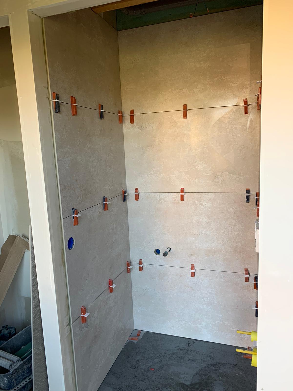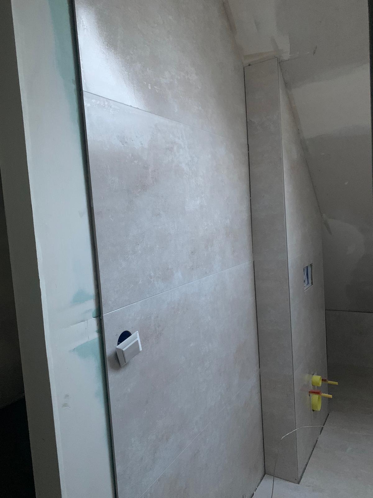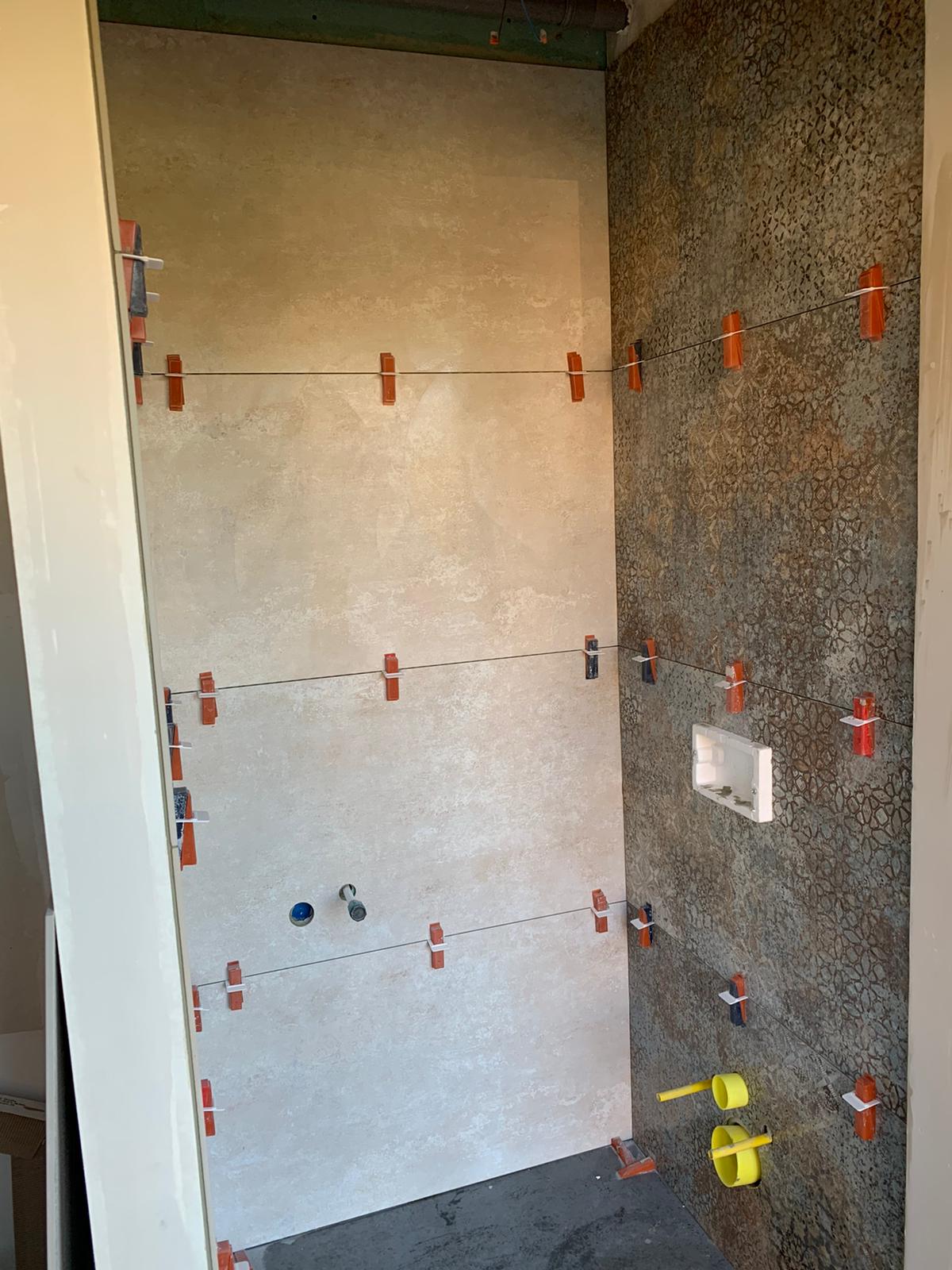 Onze klant heeft voor dit project een keuze gemaakt voor een tegel uit de serie van Naxos Fresco. Gewenst is een eyecatcher en dus betegelen we één wand van de badkamer en het toilet met Fresco decor Scaligeri 60×120. De Fresco Gonzaga 60×120 is de rustige tegenhanger voor de decor wand. Om die reden verwerken we die op de rest van het wanden. Samen vormt het een mooi geheel, goede combinatie!