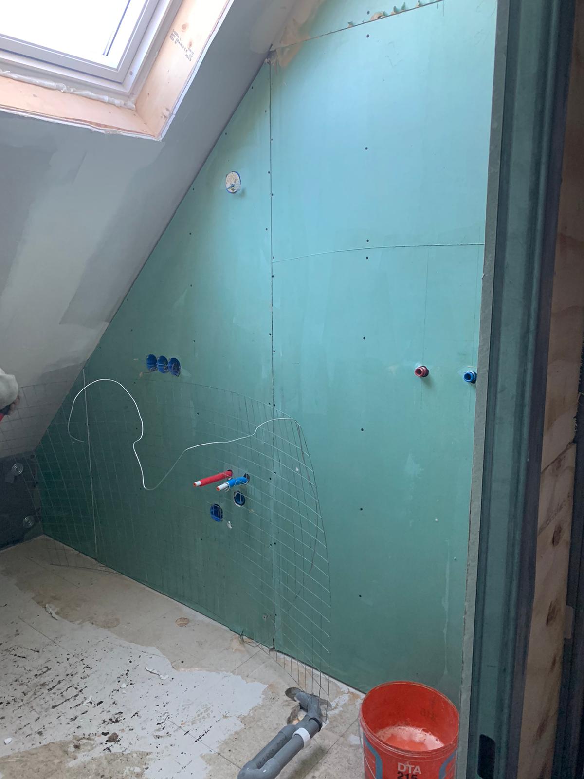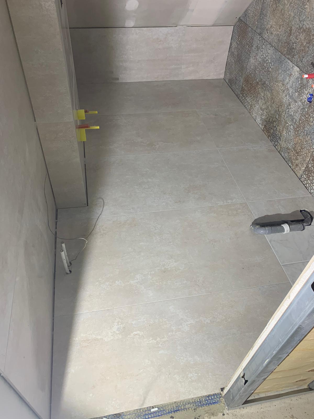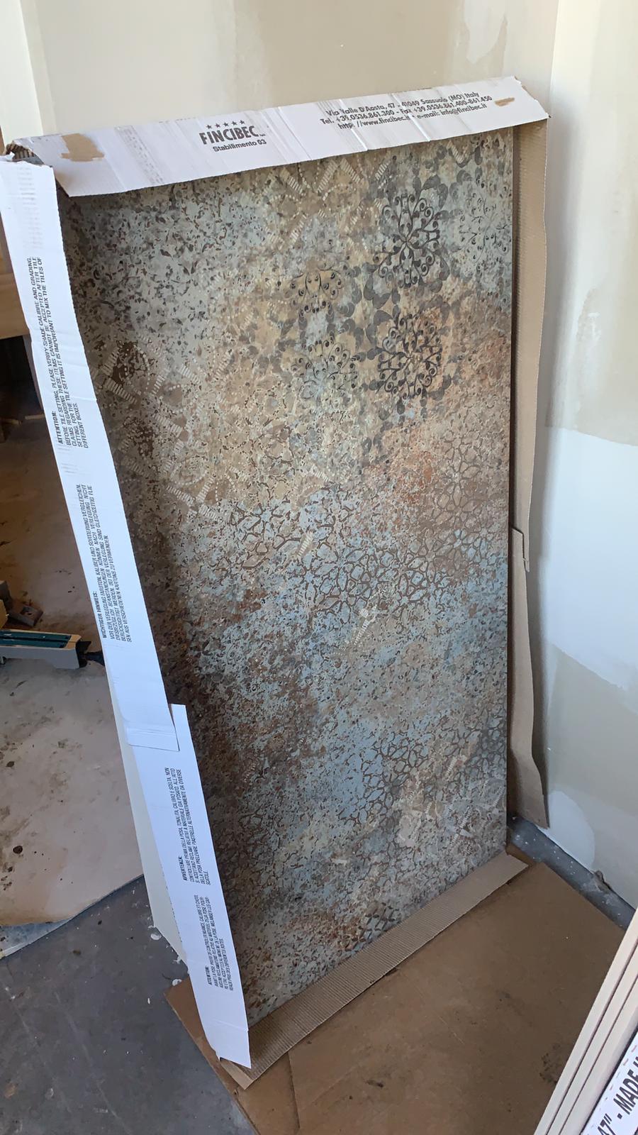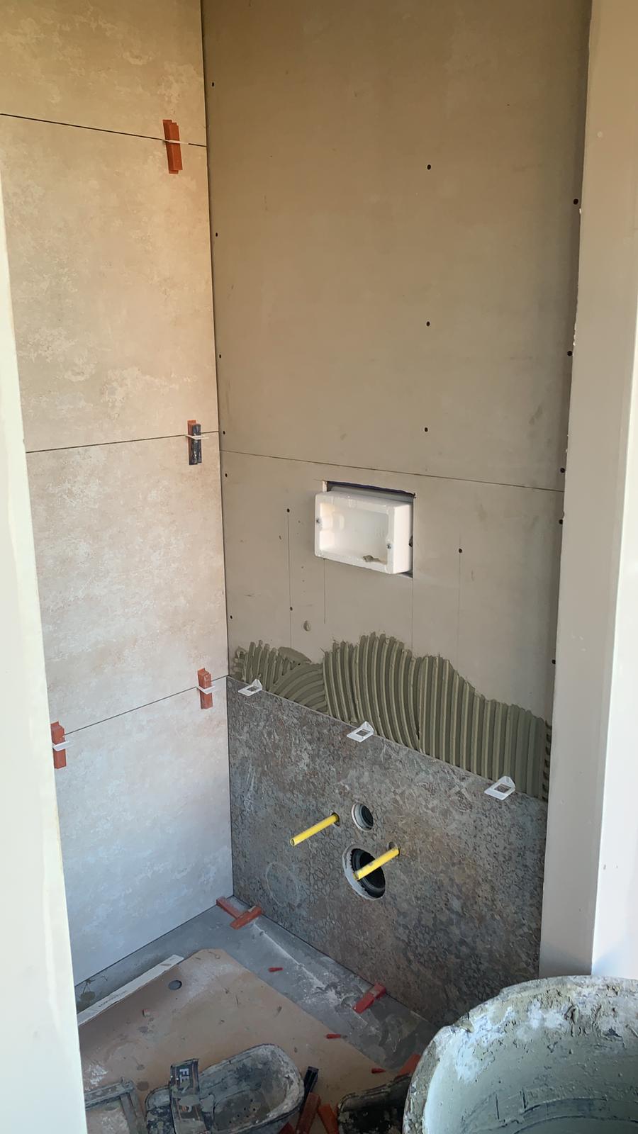 Onze klant heeft voor dit project een keuze gemaakt voor een tegel uit de serie van Naxos Fresco. Gewenst is een eyecatcher en dus betegelen we één wand van de badkamer en het toilet met Fresco decor Scaligeri 60×120. De Fresco Gonzaga 60×120 is de rustige tegenhanger voor de decor wand. Om die reden verwerken we die op de rest van het wanden. Samen vormt het een mooi geheel, goede combinatie!