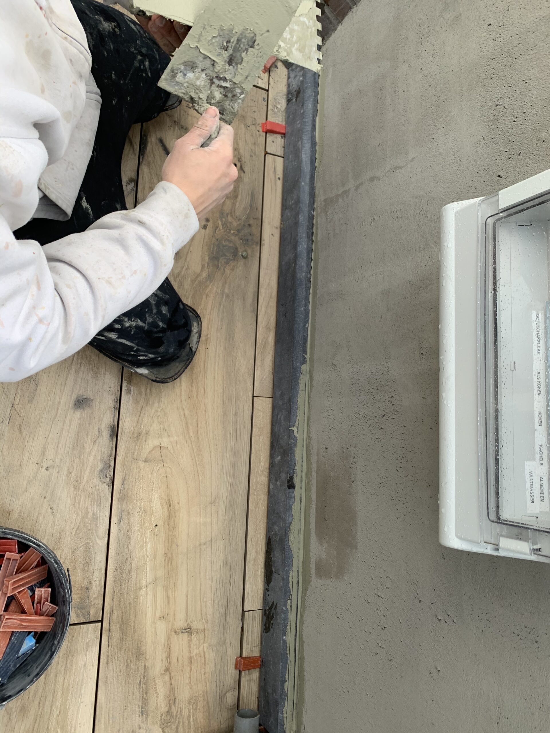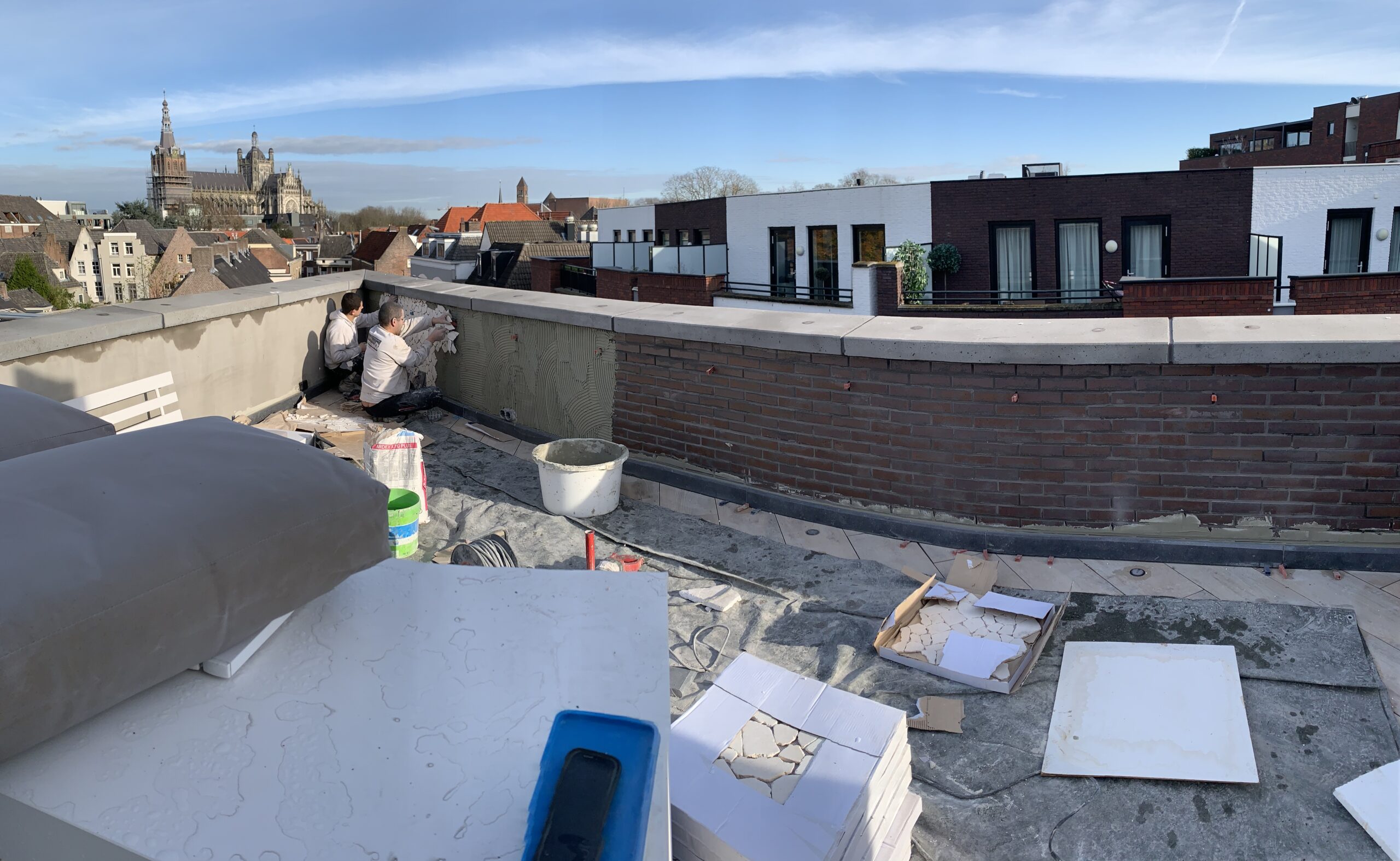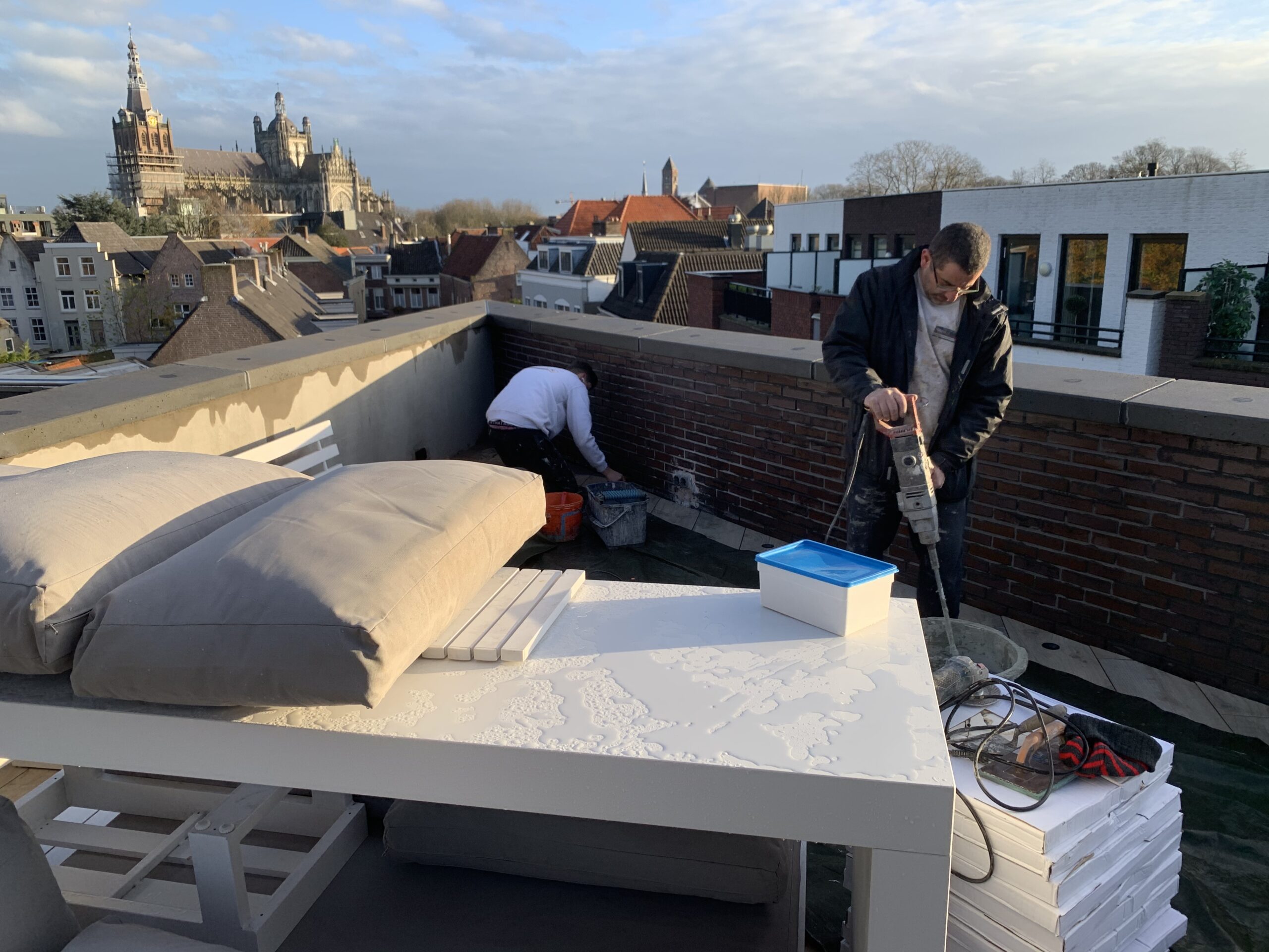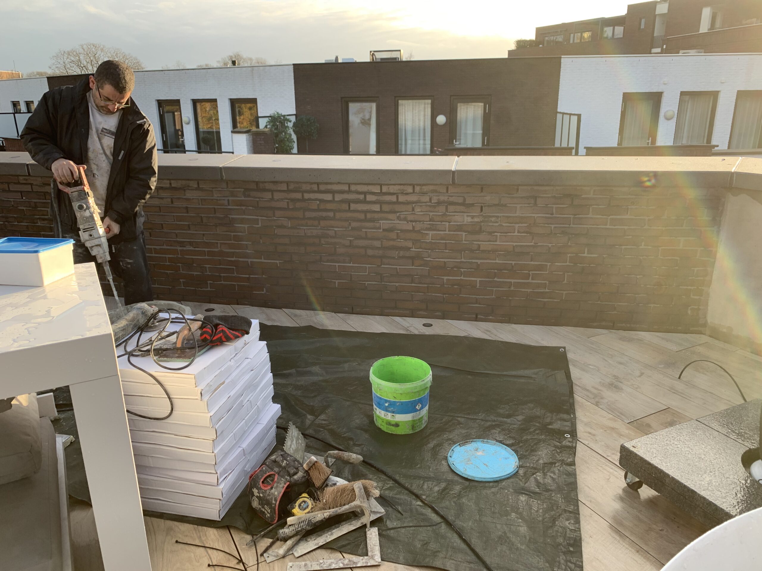 Ook bij dit project heeft de klant één aanspreekpunt. Van het leveren van de materialen, het aanbrengen op het dakterras tot het zagen van de plinten. En het afval? Dat nemen we natuurlijk mee..