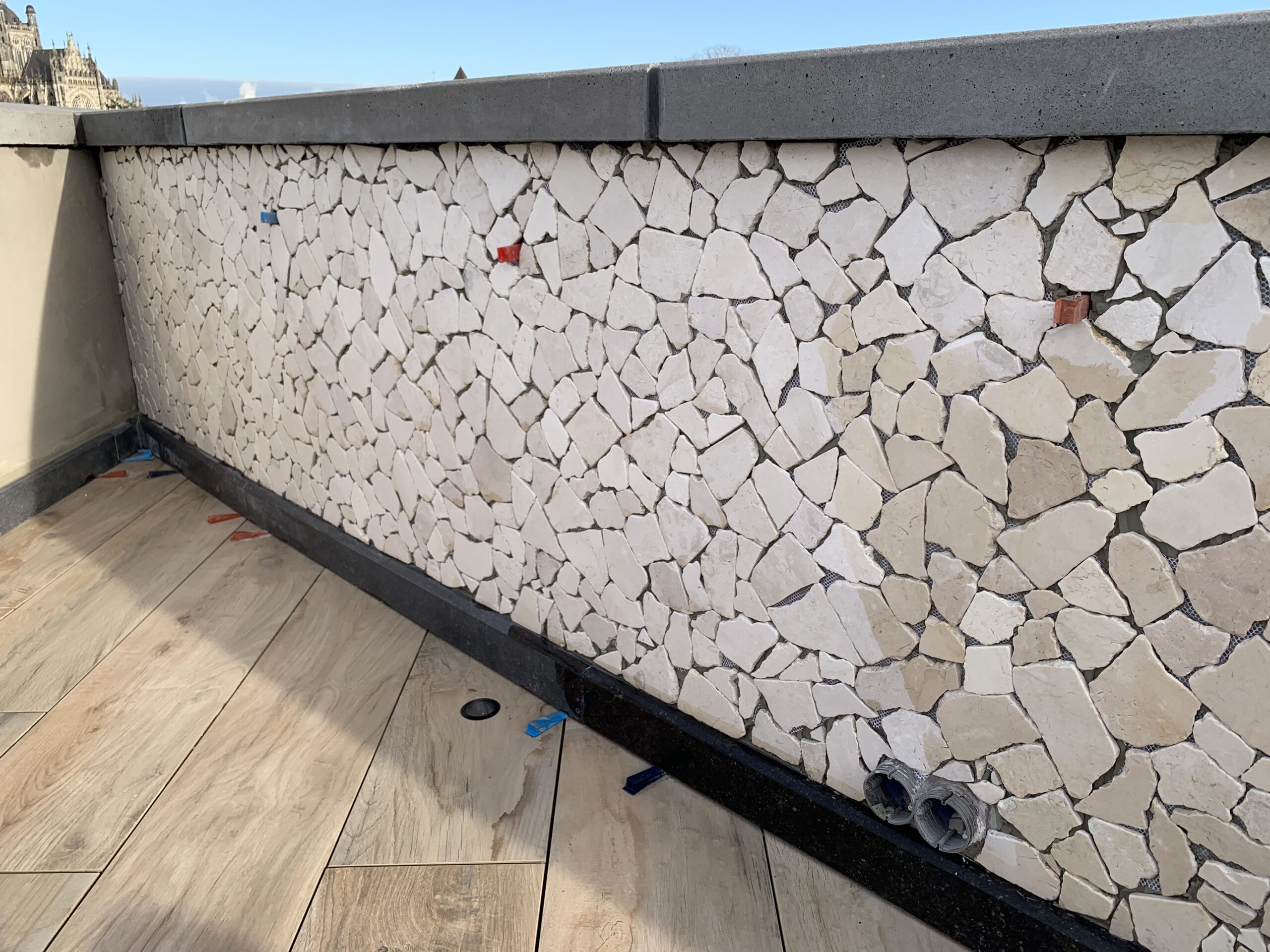 Palladiana XL Flagstones geven een prachtig decoratief accent in de wand. In dit project is de keuze gevallen op de kleur Cappuccino. Bewoner heeft de Flagstones gecombineerd met houtlook tegels waardoor dit dakterras een bijzonder exclusief en luxe uitstraling heeft.