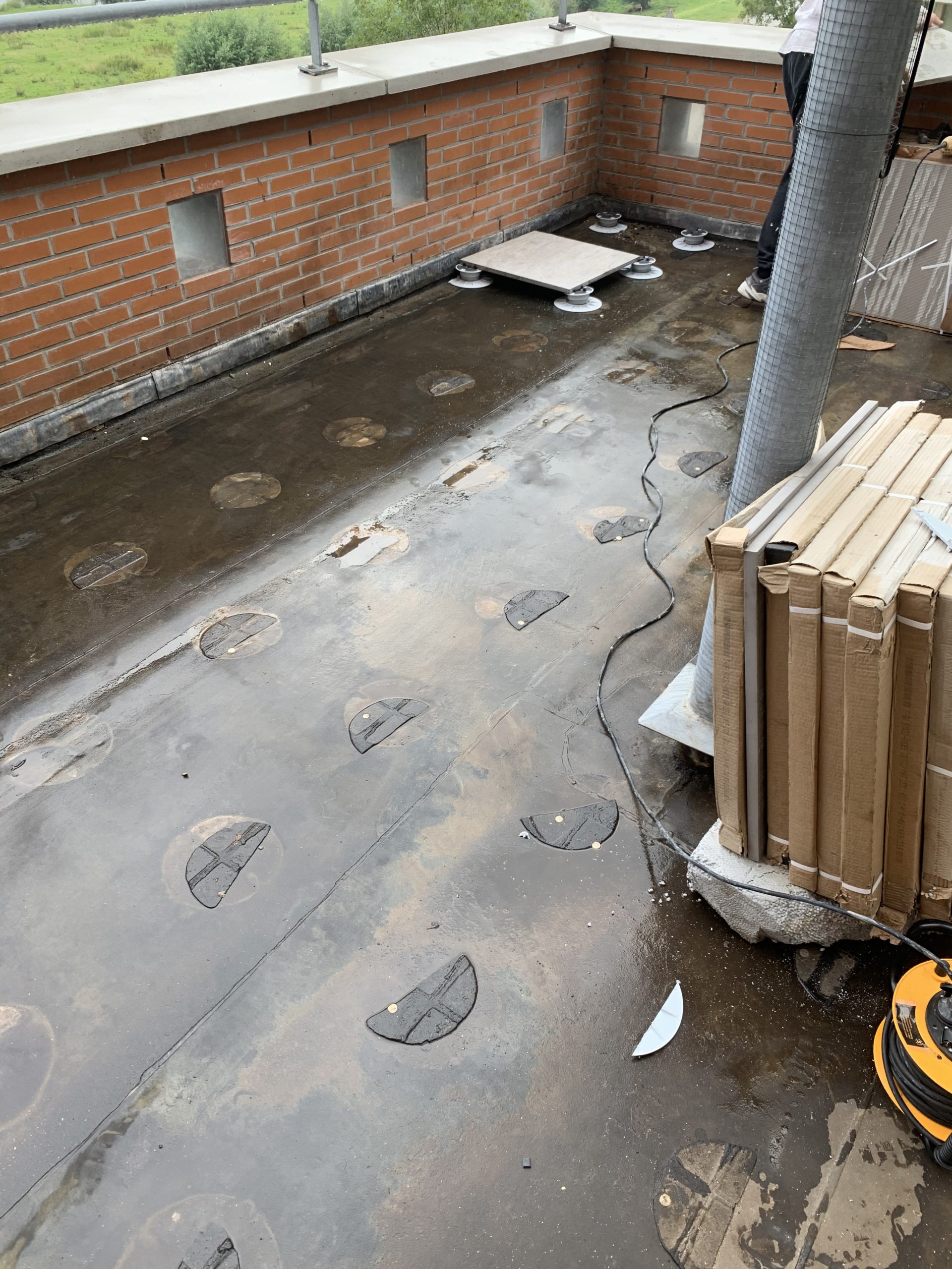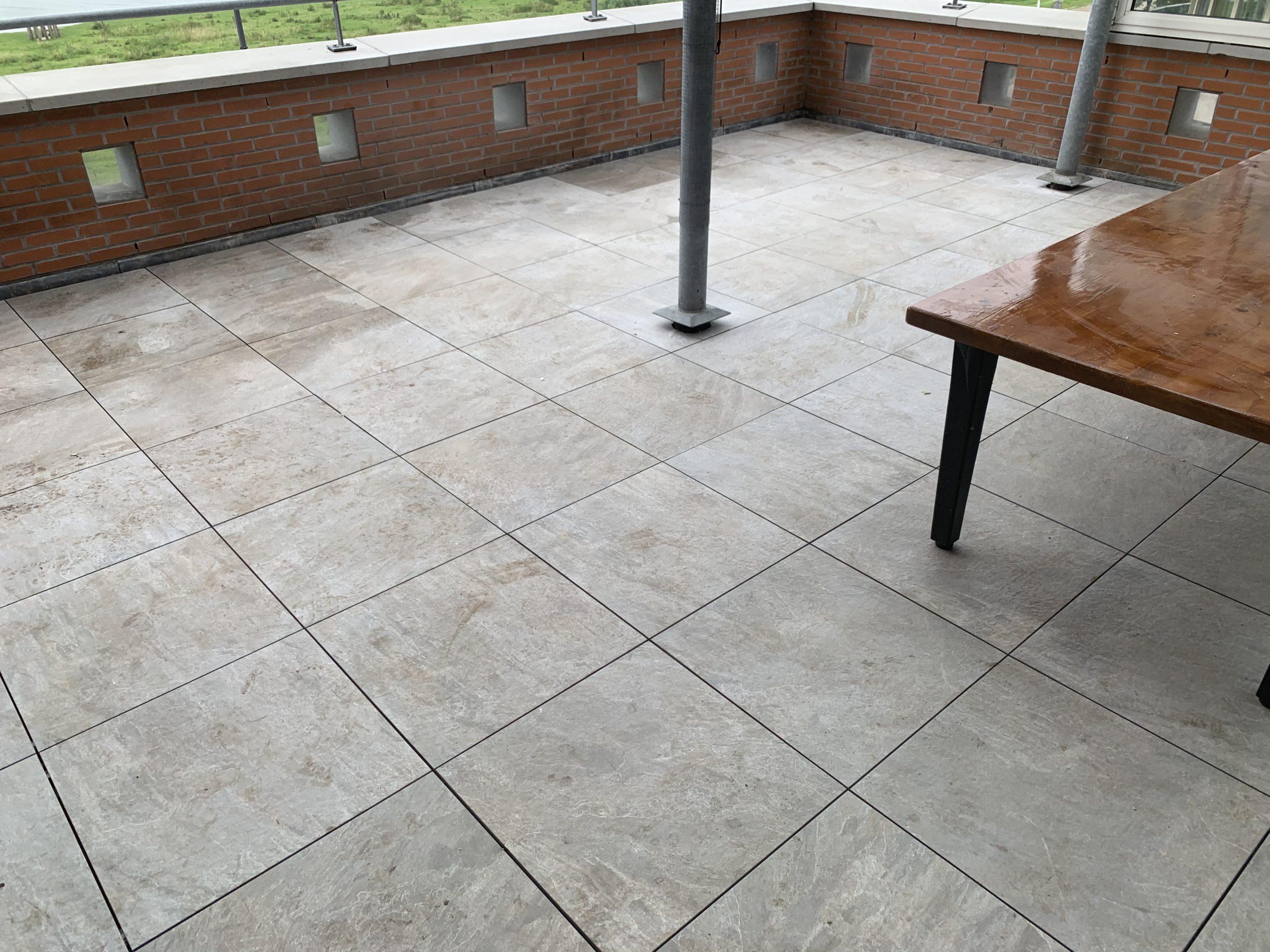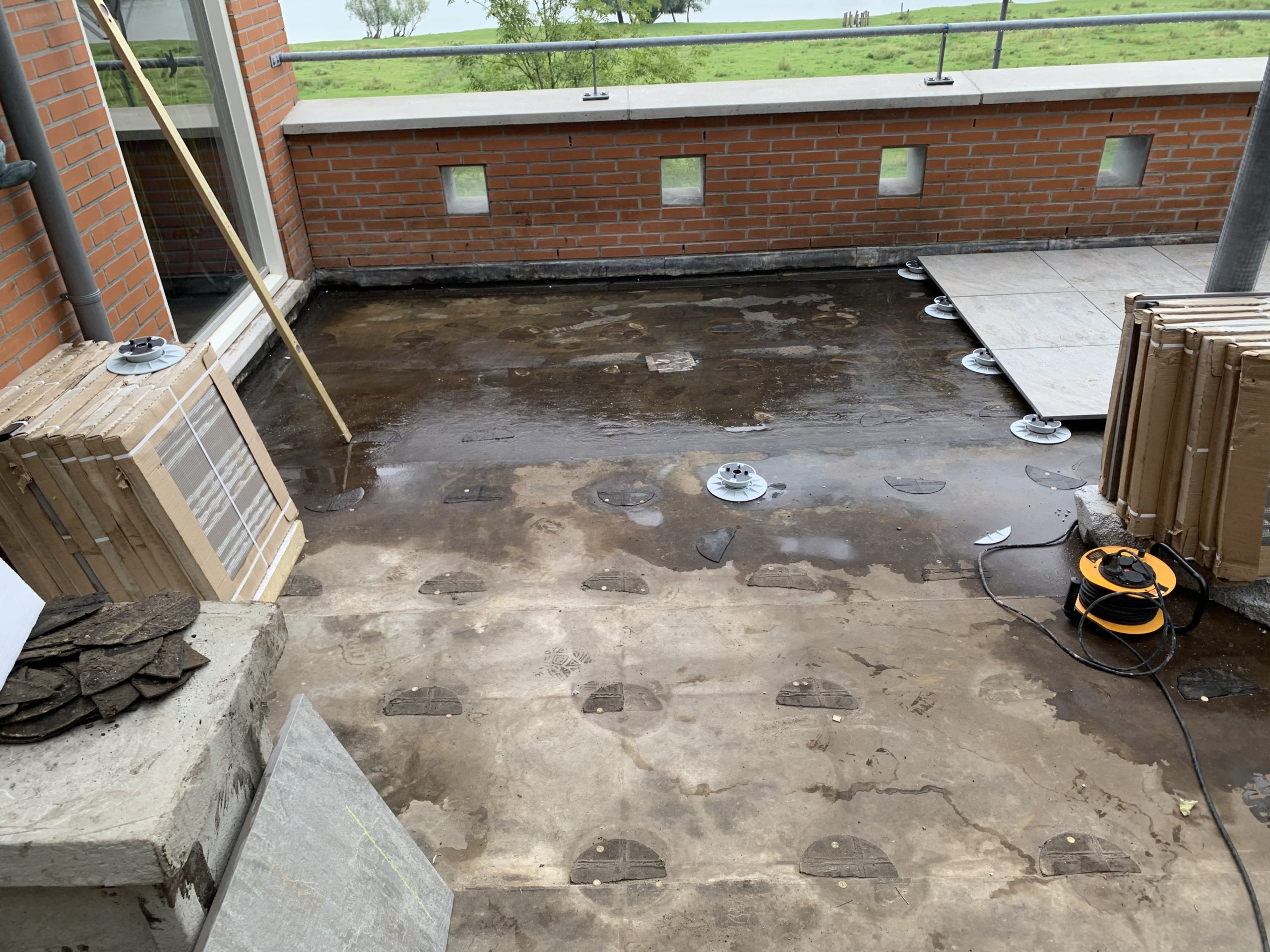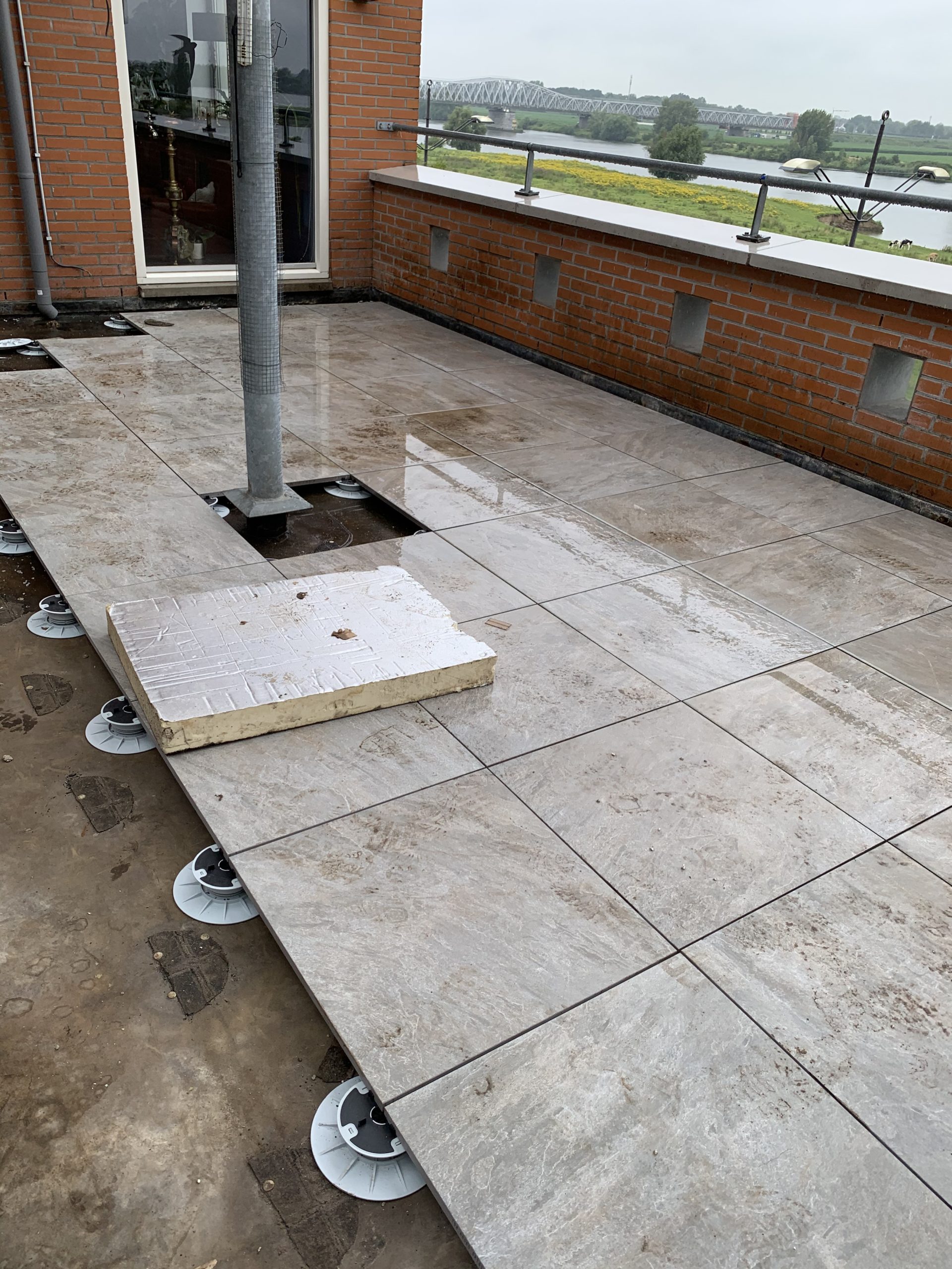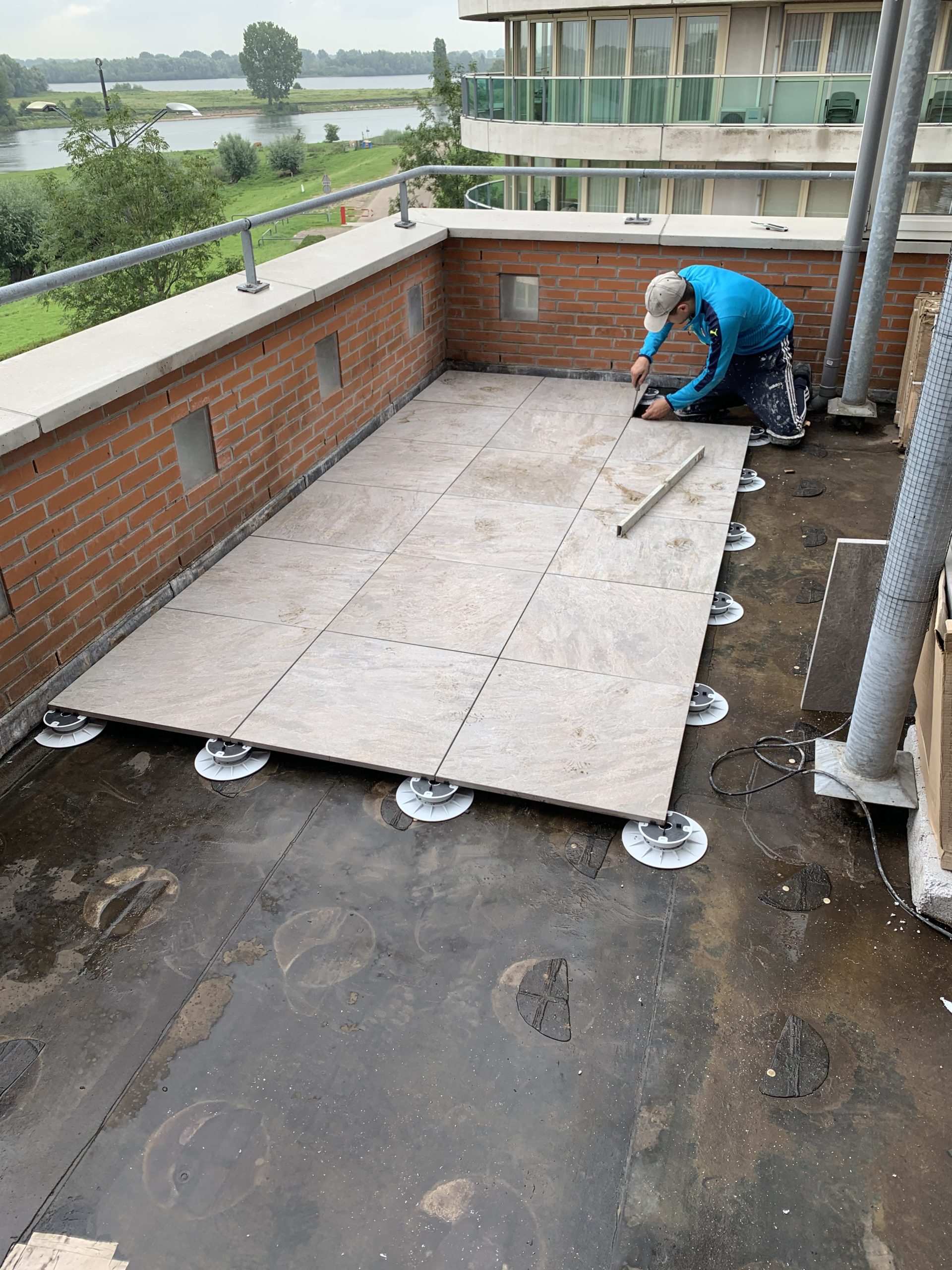 De tegels komen op verstelbare tegeldragers te liggen waardoor eventuele oneffenheden in het niveau van het dakterras geen probleem zijn. Door de open voegen kan het water naar de onderkant van de tegels en word zo makkelijk afgevoerd.